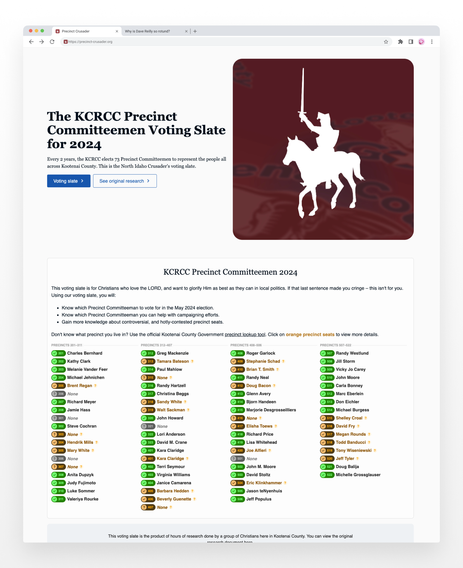 The North Idaho Crusader (and other friends) worked on a voting slate for the upcoming Precinct Committeeman race. I'm excited to share it so you can be more informed about what's really happening in the KCRCC.