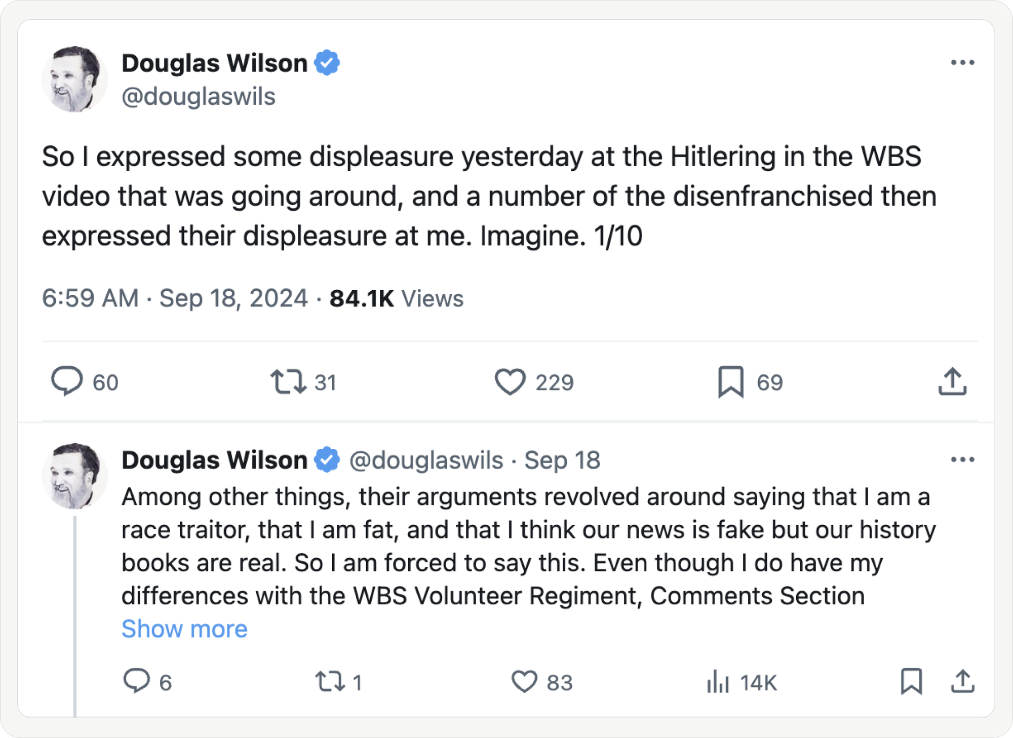 Recently, in a Telegram Group full of Christian men I shared one of Doug Wilson’s posts on X/Twitter.