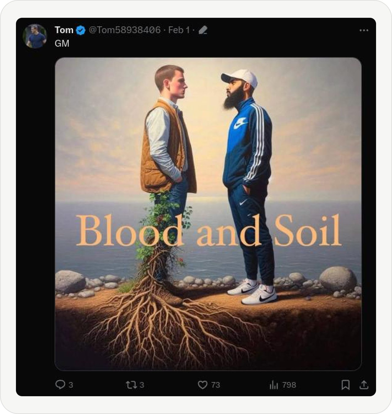 Sure, one has the freedom to share images like this but – one also has to be ready for the fallout once the public realizes you're channeling the Nazi Party (also, J.Crew Enjoyer versus BIPOC Tracksuit Man?). The issue has since resolved itself but the point stands: Doug Wilson isn't just yelling at the sky when he talks about WBS/fed bois.